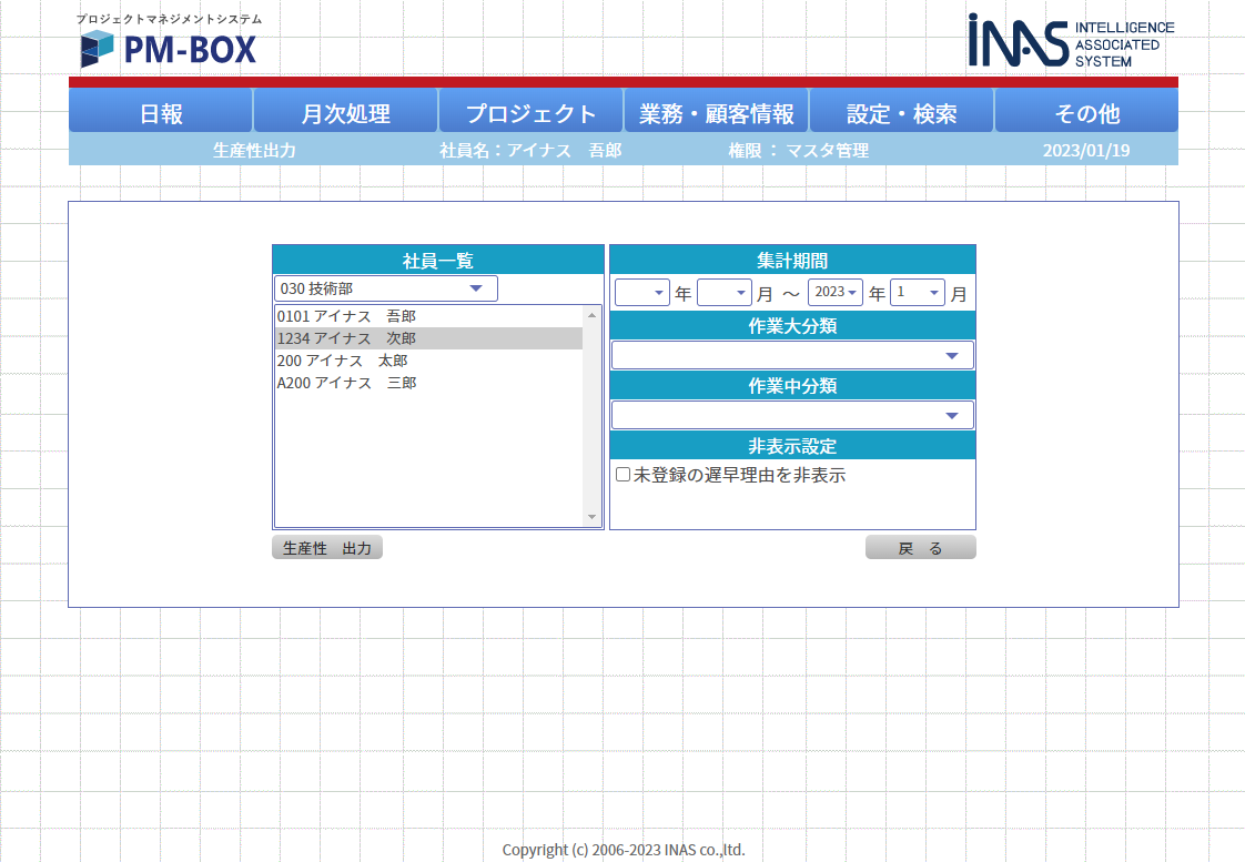 生産性はメンバー単位で出力し、作業分類毎で絞り込むことが可能です。