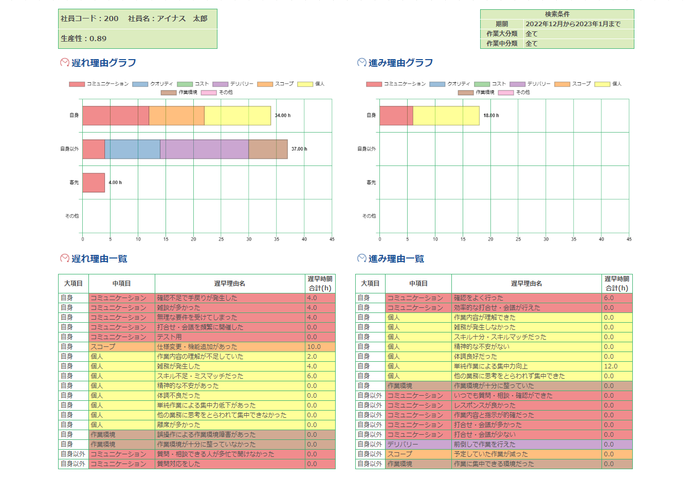 生産性の算出には工数の他に、その作業が予定よりも早く進んだ、もしくは遅れてしまった理由が加味されます。