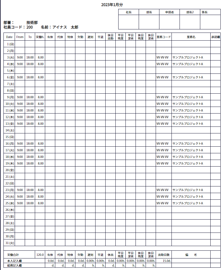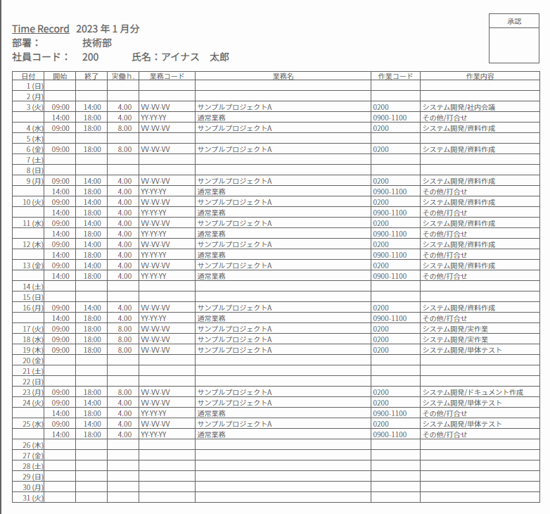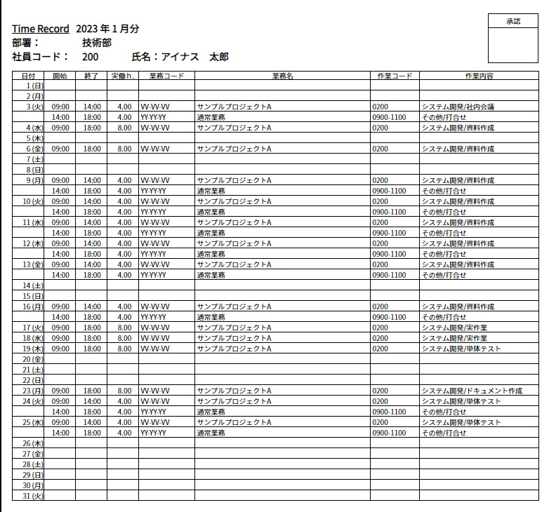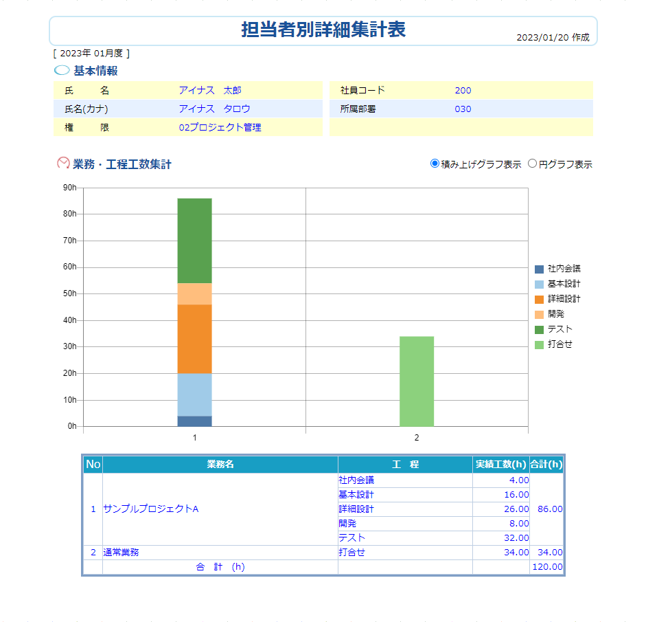 レポート 月報画面 月末を締め日とし、それに応じた月報の表示を行う画面です。実際の画面では、部署毎に複数のメンバーを選択して月報を表示することができます。日報管理画面で入力した一日ごとの勤怠情報、主に行った作業が一月分まとめて出力されます。また、有休の取得日数や残業時間などの集計結果もこの画面で確認できます。 タイムレコード画面 月報画面よりもさらに詳細に、タスク毎にどのくらいの時間行ったかを確認することができます。 担当者別レポート 指定した期間内において、メンバーがどのプロジェクトでどの程度時間を使ったかがグラフにより視覚的に確認できます。期間は一日単位で細かく設定することができます。 ページトップへ
